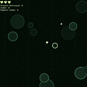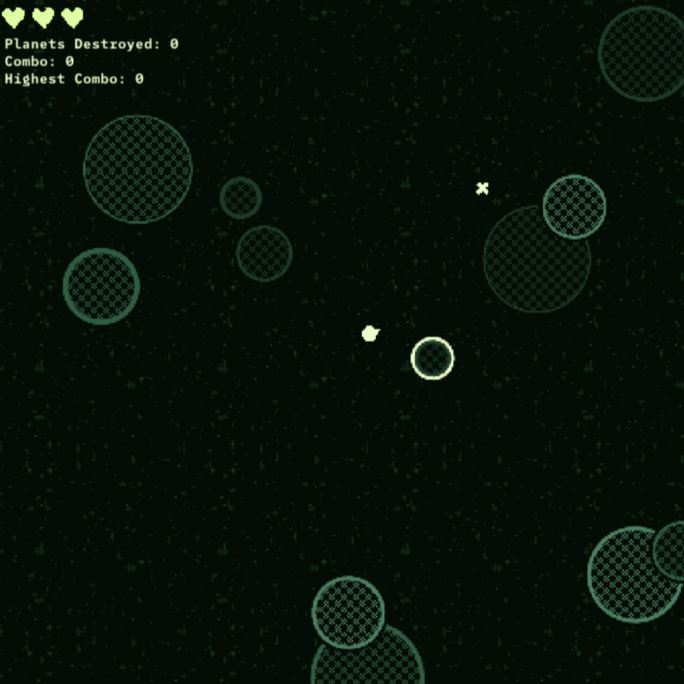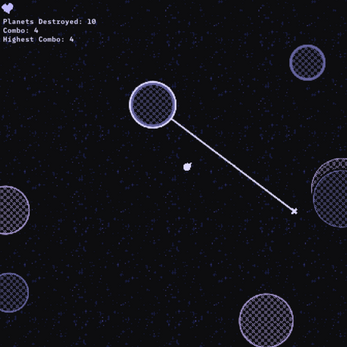 Guide your spaceship through the dangerous planet system, strategically using your tractor beam to pull planets into each other and out of your way! Survive as long as you can.